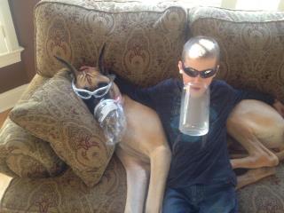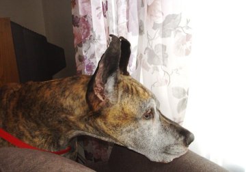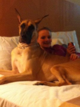 Danes are working dogs...they work at Hogging the whole bed. Diore' sharing the bed with her other owner Katie Rude